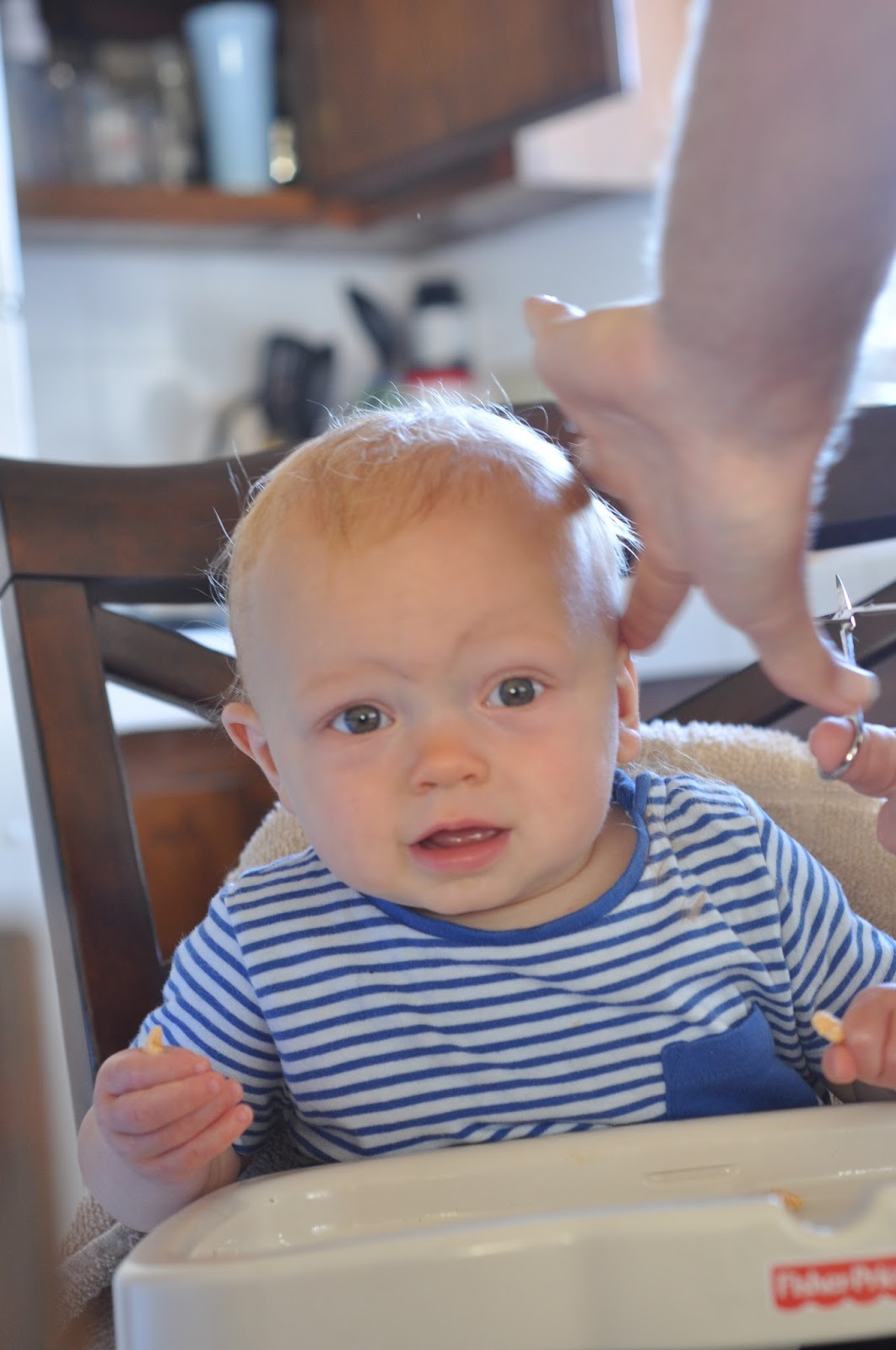 I woke up this morning to Chad coming back in our room announcing he was cutting Cole's hair. Back in college he used to cut his friends hair for pizza, so he has a lot of experience ;) He did a great job on Cole, but I don't think anything can prepare you for a wiggly baby as your client.